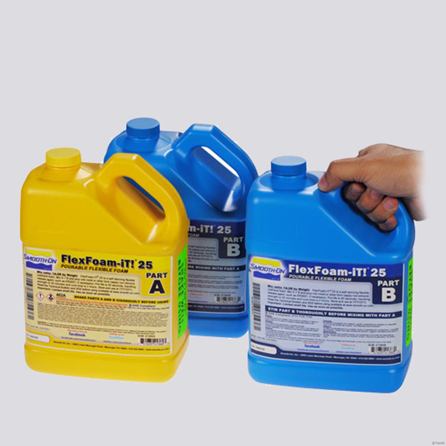 Part A and B liquids are combined, mixed and poured into a mold or other form (apply release agent if necessary). Mixture will rise and cure quickly to a solid, flexible foam. Foams vary by density and offer good physical properties. FlexFoam-iT!™ 25 is the highest density foam and expands the least.